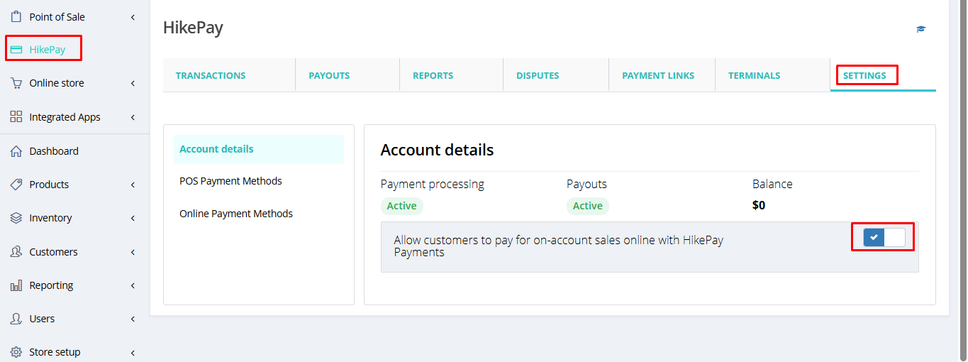 - Enable the option: “Allow customers to pay for on-account sales online with HikePay
