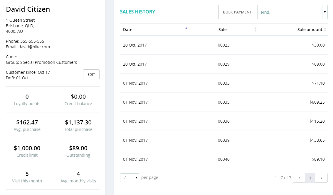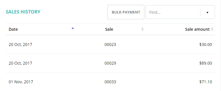 Once you have selected your customer (from the Customers List View) click on BULK PAYMENT next to the Customer’s Sales History.
