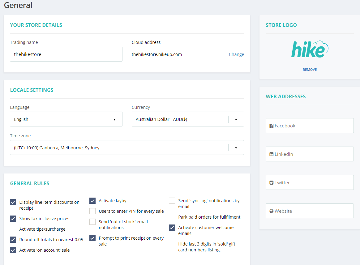 To begin, select Store Setup on the Hike Menu and navigate to the General screen.