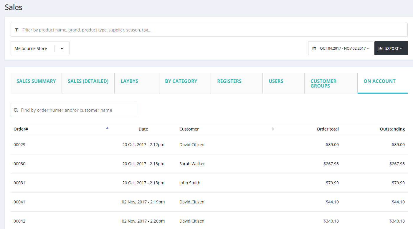 Once you’ve landed on your Reporting screen, select the ON ACCOUNT tab, which will let you view all ‘on-account’ sales that have been created.