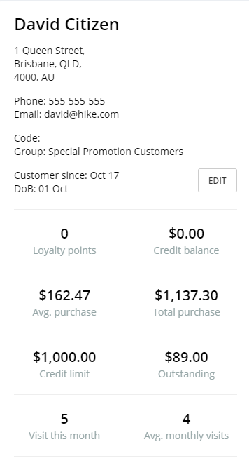 When selecting a customer using the Customers List View, Hike will give the retail a number of details surrounding the Customer’s transactions.