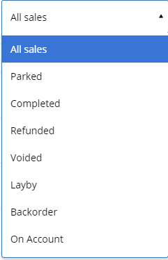 The FIND drop-down menu will enable to you to filter the previous sales history via its sales type, i.e., Completed, Parked, Lay-By, On-Account etc.