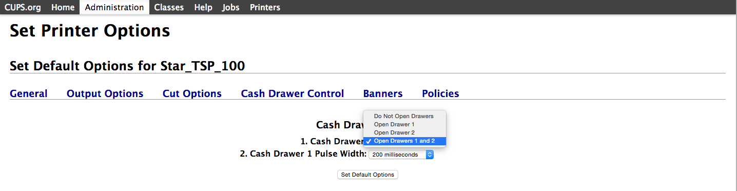 From here, select Cash Drawer Control, choose Open Drawer 1 and 2, under Cash Drawer, and click the Set Default Options button below.