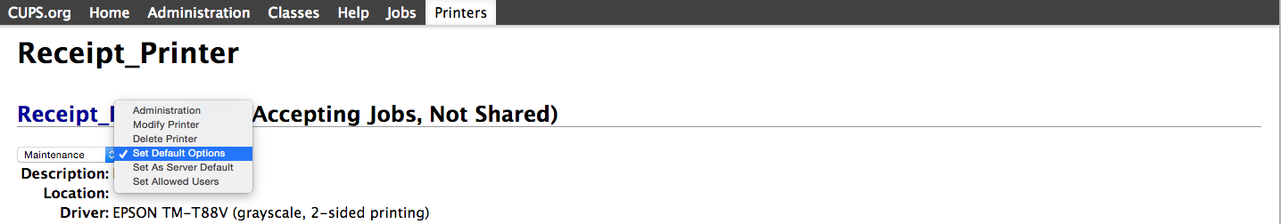 This will take you to CUPS. CUPS is a networking printing service used by Mac computers. It will allow you to setup your printers on a network, and customize options such as cash drawer setup.