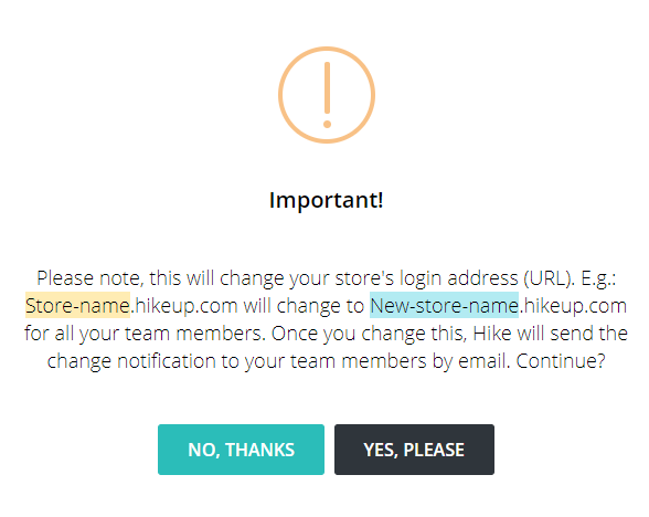 By selecting Change, a new pop-up will appear explaining that by changing your store’s login address, the new address will be applicable for all users, you currently have in Hike. Click on Yes, Please to continue.