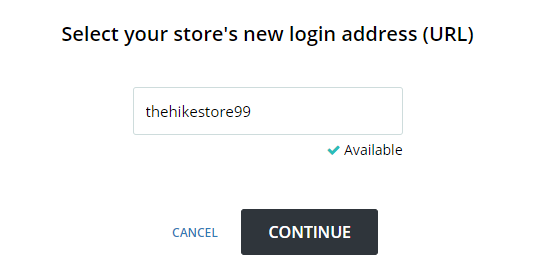 You will then be able to change your store’s login address to something new. If the name has not yet been taken, you will see that it is Available, and will be free to select Continue. If it is unavailable, a red-cross will appear, with the Continue button unable to be clicked.