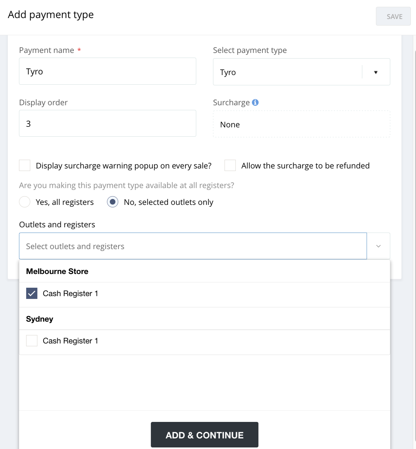 If selecting Selected Outlets, a drop-down box will appear, enabling you to choose which of your stores and registers that new payment type will be available in.
