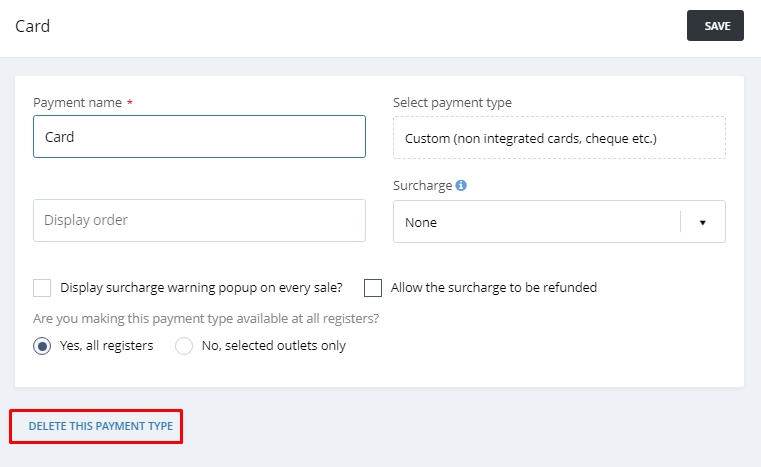 Once you have completed all the relevant fields click on SAVE at the top-right of the screen, to save the payment type.