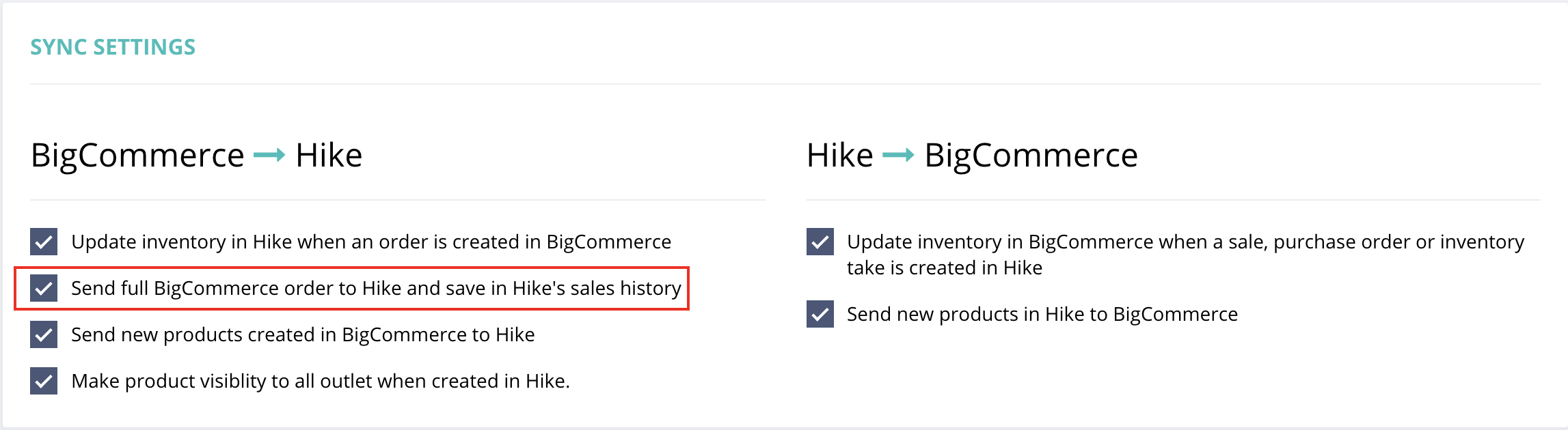 Reason 1: If you haven’t checked the box “Send new products created in BigCommerce to Hike” in the Integration sync settings page, as shown in the image below, then the new products won’t sync from BigCommerce to Hike.