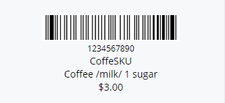 Here is an example of a barcode for a Coffee, where the barcode number appears directly beneath the barcode, and the list of variants for the Coffee and price also appear.