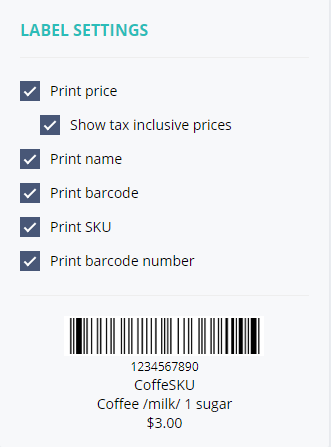 A generic barcode template (Coffee) is available to see how your barcode will look as you select or de-select the various Label Settings options.