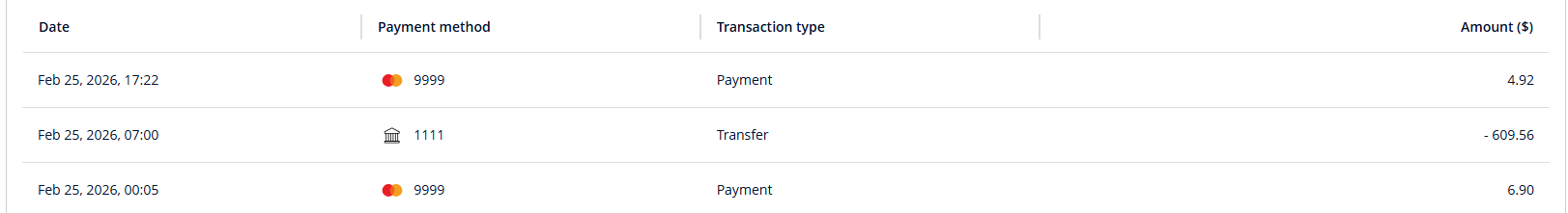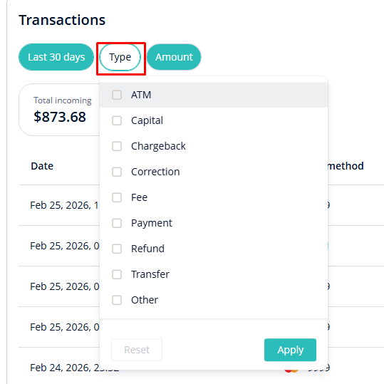 Filter transactions by type, such as payments or transfers.
