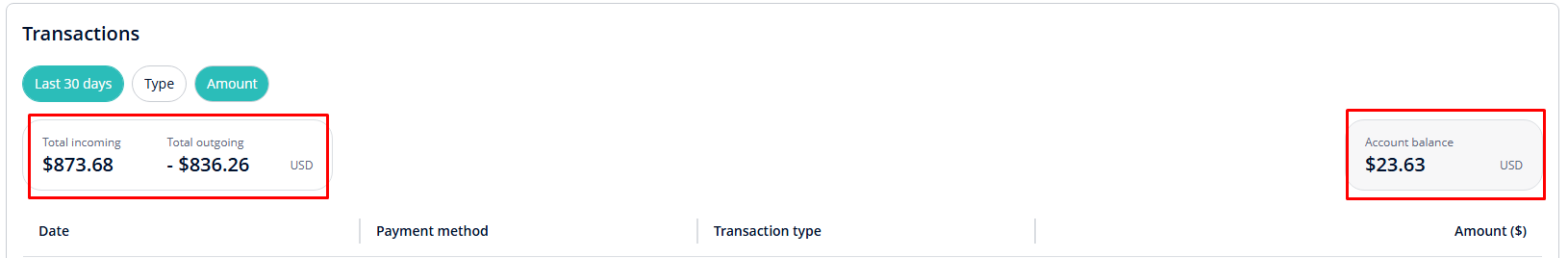 The Transactions overview summarises your payment activity for a selected