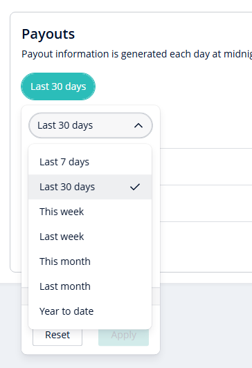 filter to quickly view payouts generated within the most recent 30-day period.