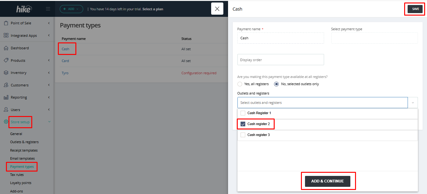 In Hike POS, each payment type (e.g., Cash, Card, Tyro) can