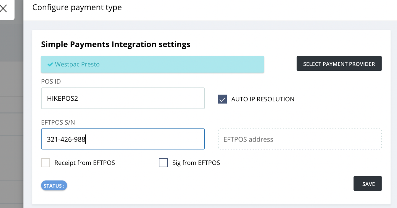 Westpac terminal into the field of EFTPOS Address. You can choose