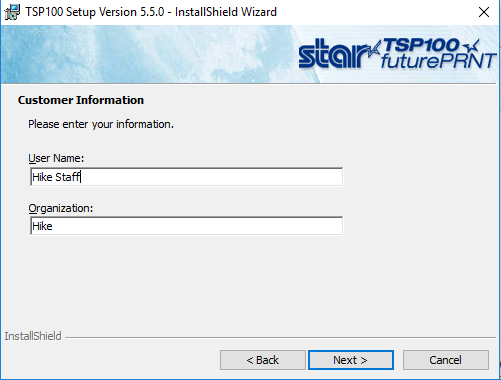 You will then be prompted to give your Star Printer a User Name and Organization. Click Next to continue.