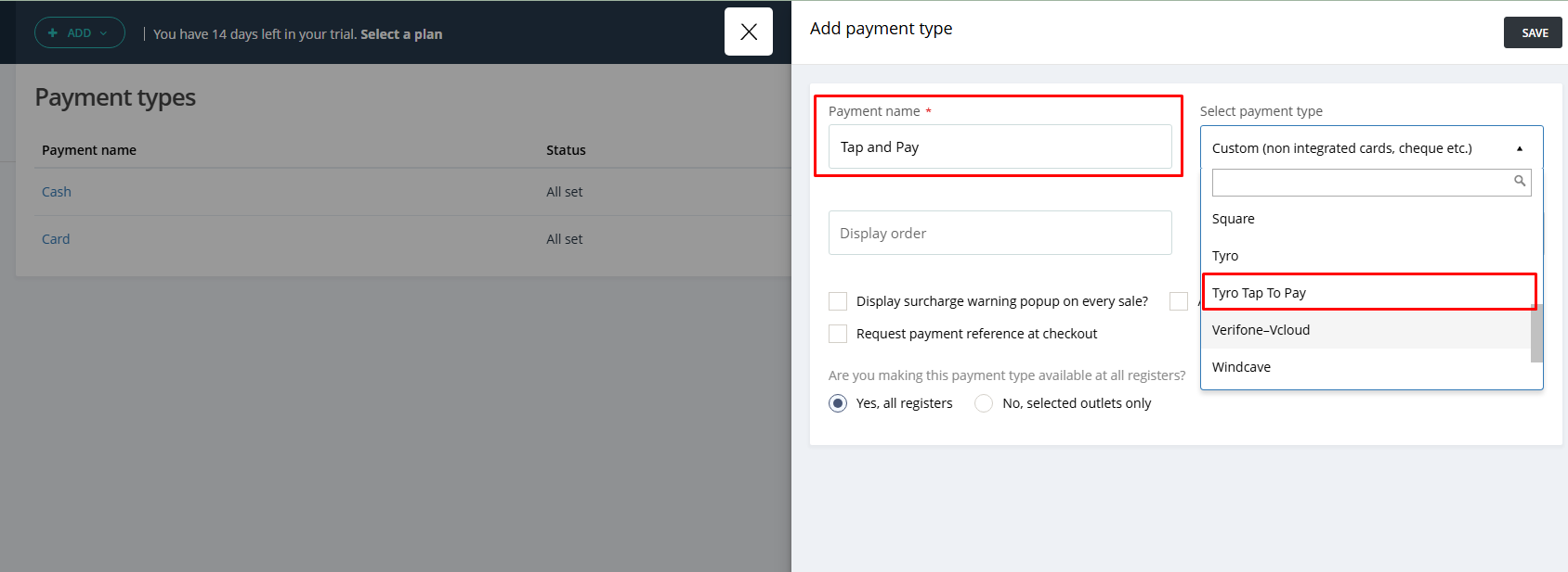 A new window will slide out which will have option to select Tyro Tap To Pay out of available payment types in Australia.