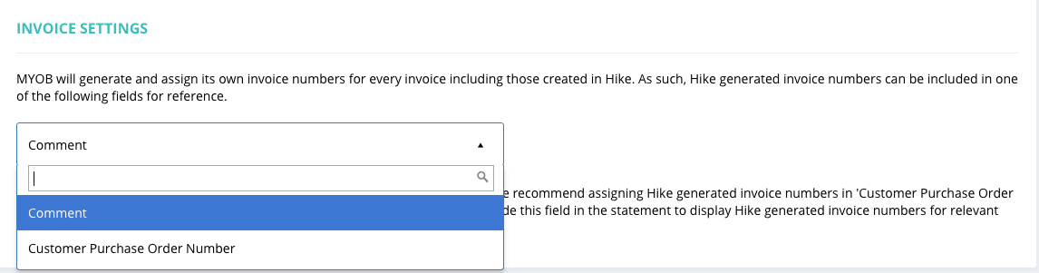 MYOB will generate its own reference number for every one synced from Hike. Therefore, Hike will enter the invoice number in Hike into either of the two fields, comment and customer purchase order number, as a reference. Please choose it as per your requirements.