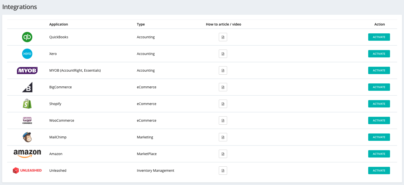 2. From there you will find a list of applications to which Hike connects to. Integrate your MYOB AccountRight or Essentials account, by clicking on Activate to the right of the MYOB icon.