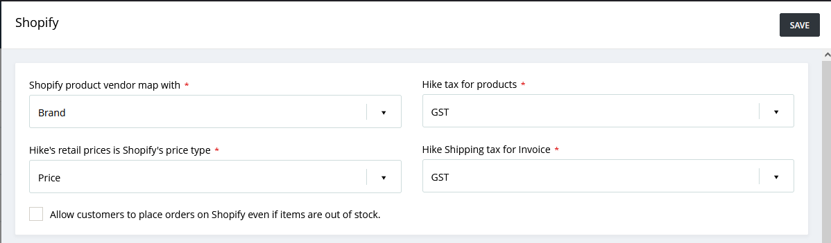 Here you will find all the sales tax options set in Hike. Select the ‘Hike tax’ that is best suited for your Shopify’s online store needs so that when orders are synced, the tax amounts are matched correctly.