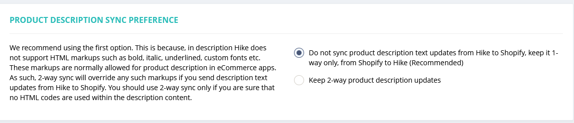 These settings allow you to select how you wish to manage your product description between Hike and Shopify. Either Shopify to Hike to or 2-way.