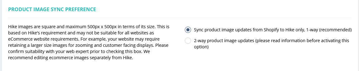 These settings allow you to select how you wish to sync and manage product image sync between Hike and Shopify. Either Shopify to Hike or 2-way.