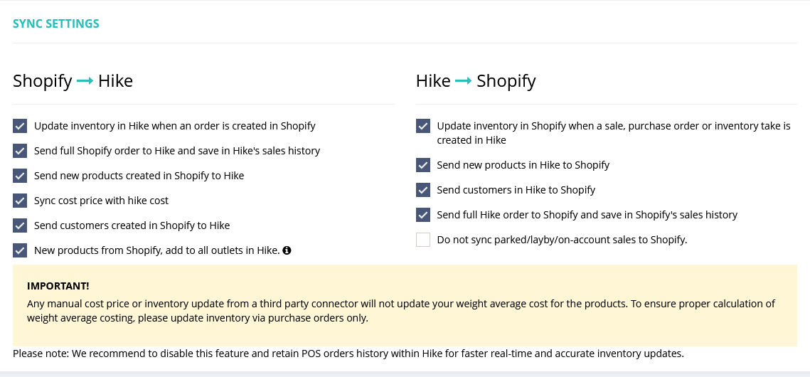 On the Shopify settings screen, you’ll be able to establish exactly how you want your Hike & Shopify pairing to work.
