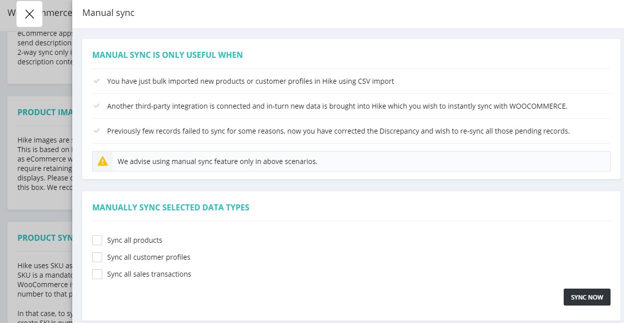 This section will be relevant if you ever wish to manually force your data between Hike and WooCommerce to sync. This may be required if there was a sync error that you corrected, and you need to sync your data again.
