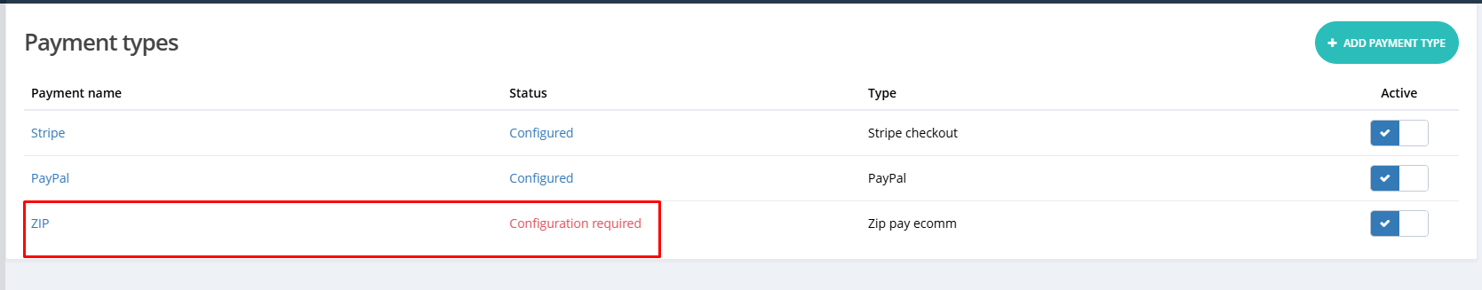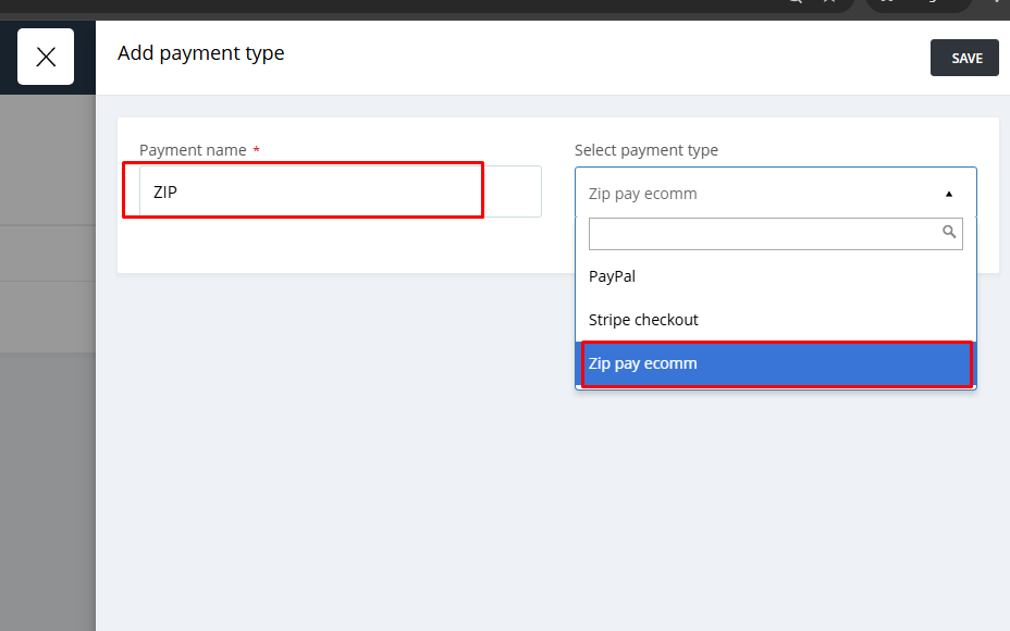 Here, please select a name for this payment type and select the Zip pay ecomm from the drop-down menu.