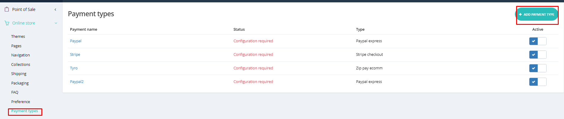 Payment Types are a big part of your online business. These will be the options you provide to your customer to pay for the online orders.