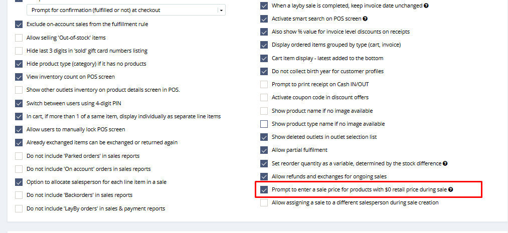 You will find the option "Prompt to enter a sale price for products with $0 retail price during sale"