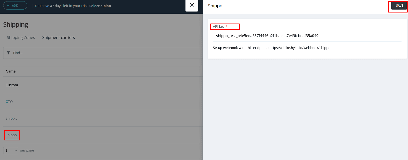 - Paste the API secrete it into Hike Shippo configuration Popup
