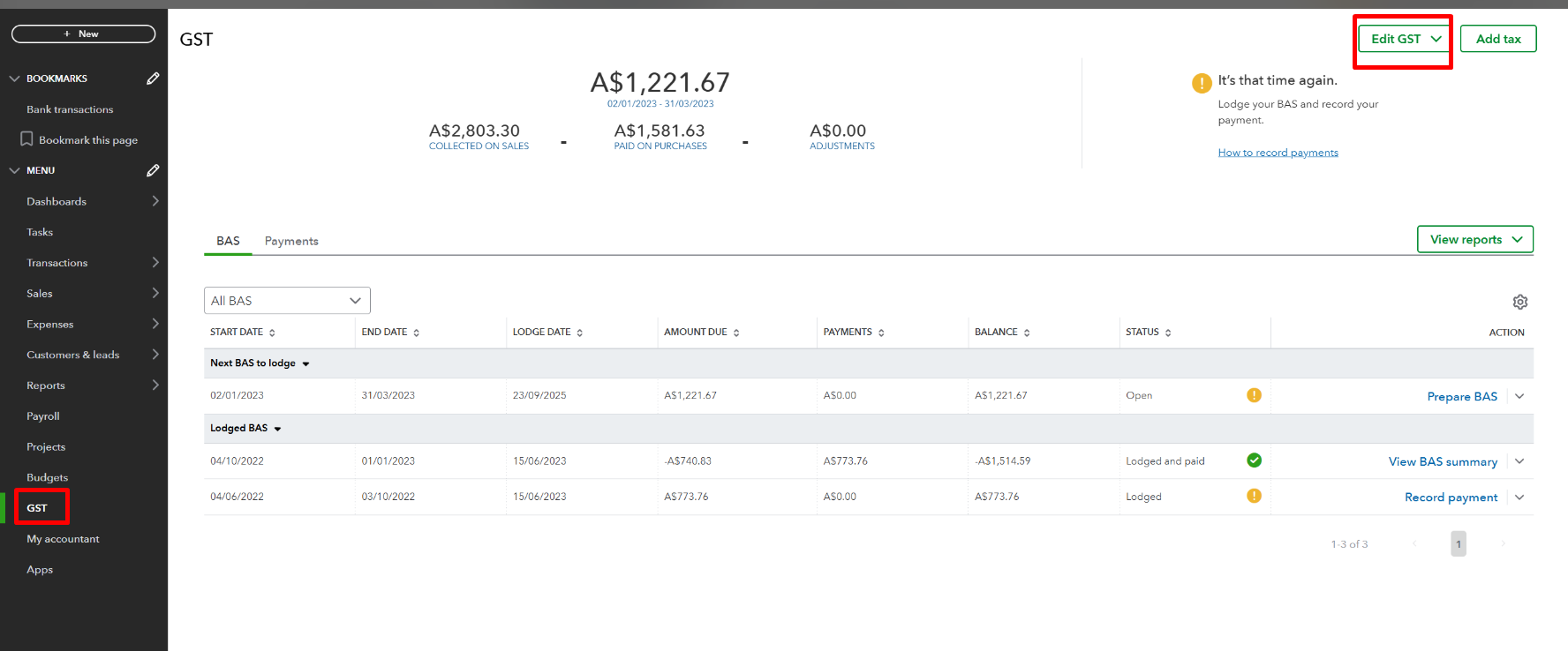 Navigate to Taxes → Edit tax (or Taxes → Sales Tax Rates, depending on version).
