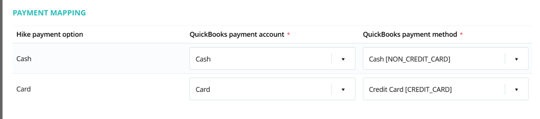 Map each Hike payment method (Cash, Card, Bank Transfer) to the corresponding QBO account.