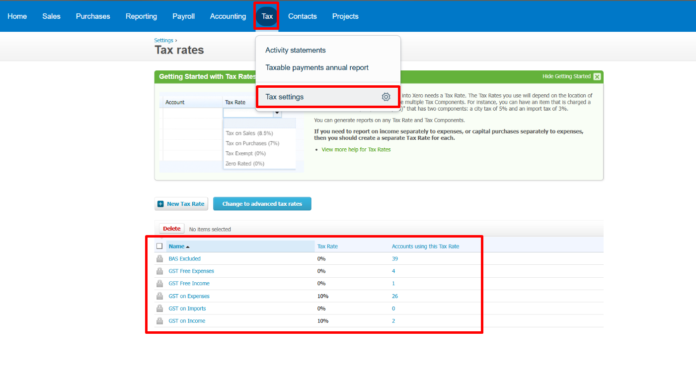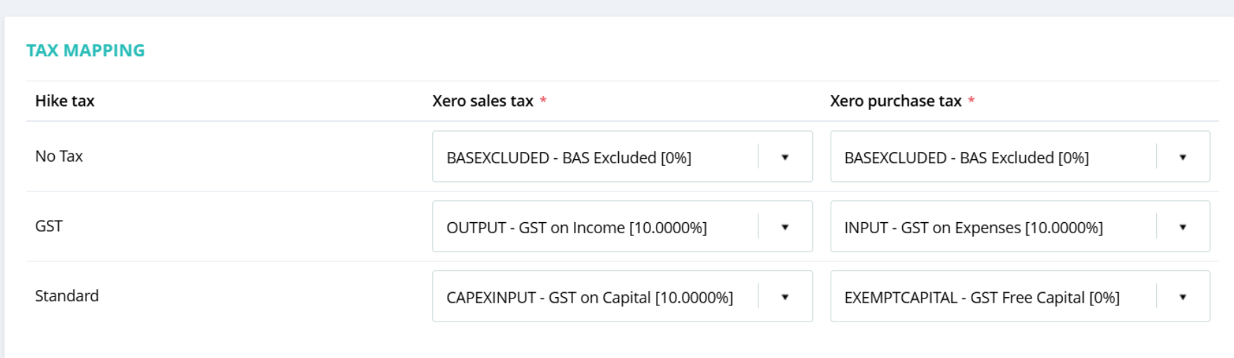 Select the Hike tax rates and map them to the corresponding Xero tax codes.