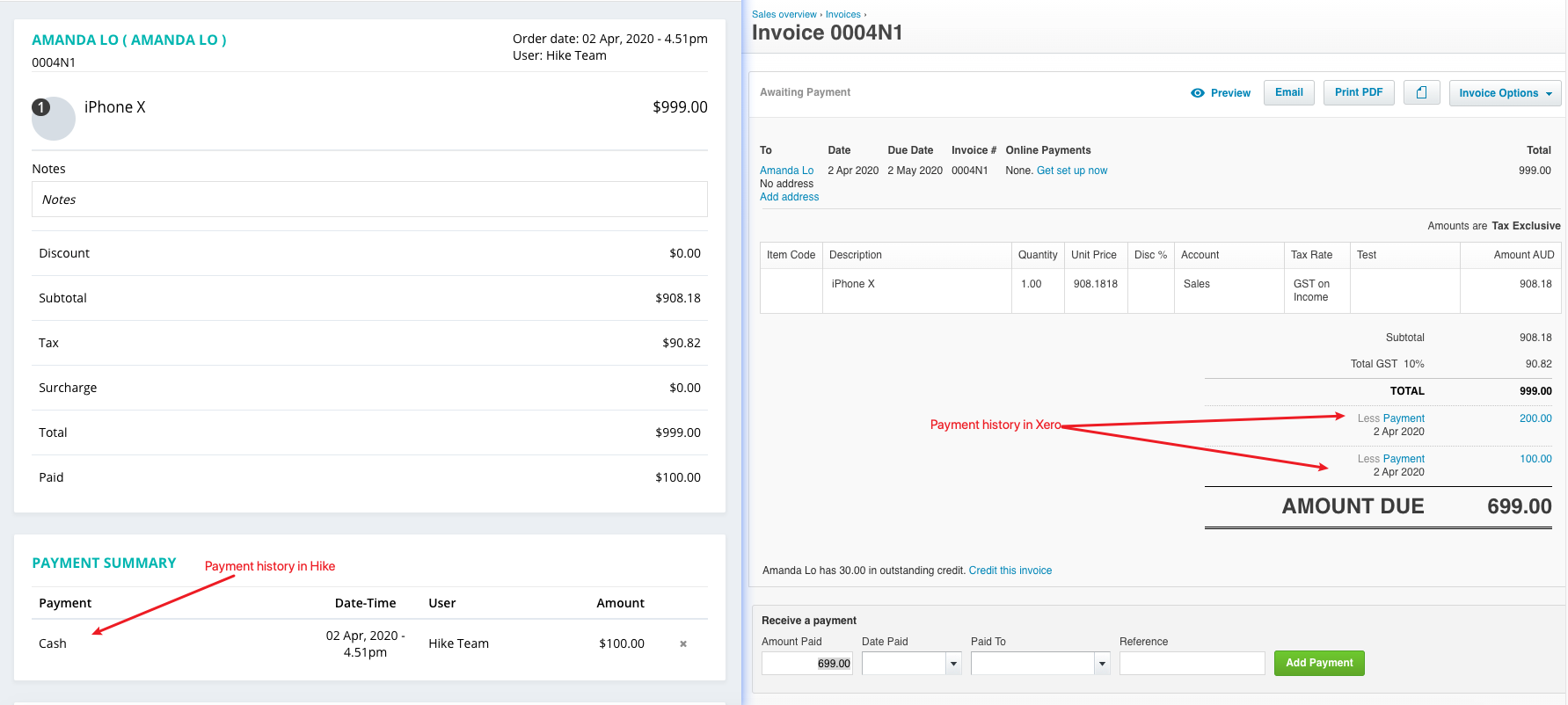 Scenario 1 - individual invoice - trying to complete the on-account sale in Hike while the previous payment amount recorded in Hike is less than that in Xero